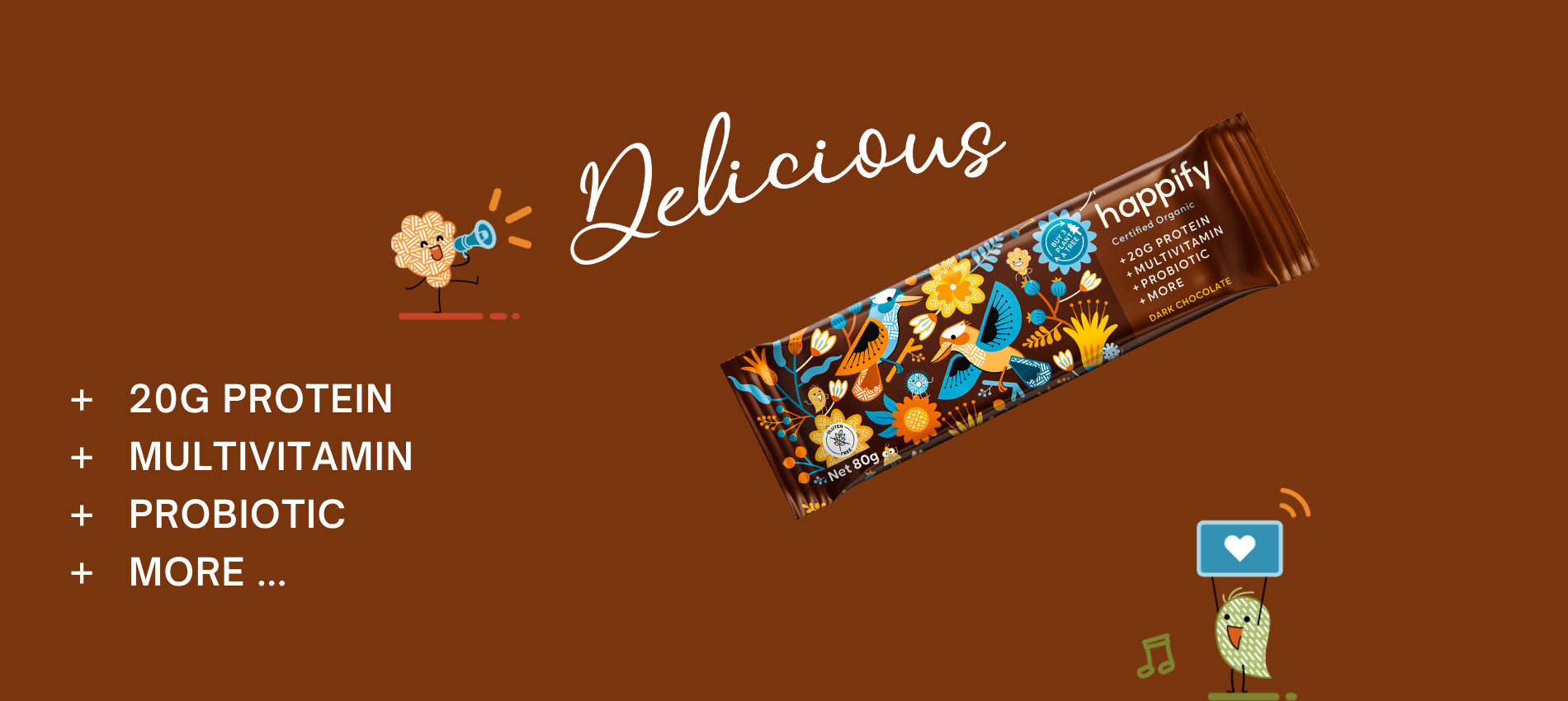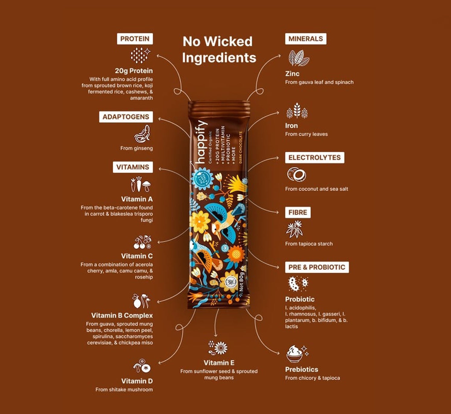 One Happify Bar contains 20g+ of protein (with full amino acids profile), vitamins a, b complex, c, d & e, essential mineral electrolytes iron, magnesium & zinc, pre & probiotics, as well containing an excellent source of fibre.